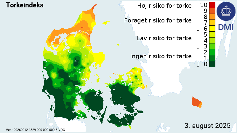 Her i starten af august 2025 er der store forskelle på tørkeindekset i Danmark. Hvor den sydlige del af Danmark har et tørkeindeks på 0-1, så ser det helt anderledes ud i Nordjylland, Nordsjælland hvor tørkeindekset for de fleste steder ligger over 7-8 og på Bornholm ligger det højt ca.8-9. Selvom vi har fået en del regn de seneste dage, så er tørkeindekset her i Gribskov 3.8.2025 -6.5 – og Bornholm er kommet over 9 -faktisk 9.1