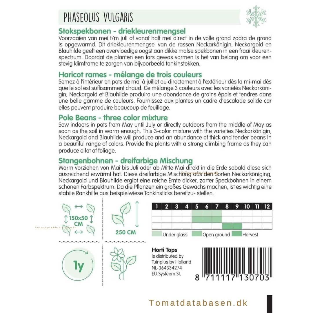 ‘Neckarkönigin, Neckargold og Blauhilde’ er de tre stangbønne sorter der er i denne blanding.Sås indendørs i potter fra maj til juli eller direkte udendørs fra midten af maj, så snart jorden er varm nok. Sorterne er kendte for at levere en overflod af tykke . Planterne har brug for noget at klatre op af fx. støtte pinde eller jutesnor.