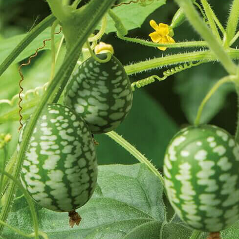 ‘Mouse melon, Cucamelon’ er en anderledes og sjov lille klatreplante, som er hurtigtvoksende og som producerer et væld af små frugter.