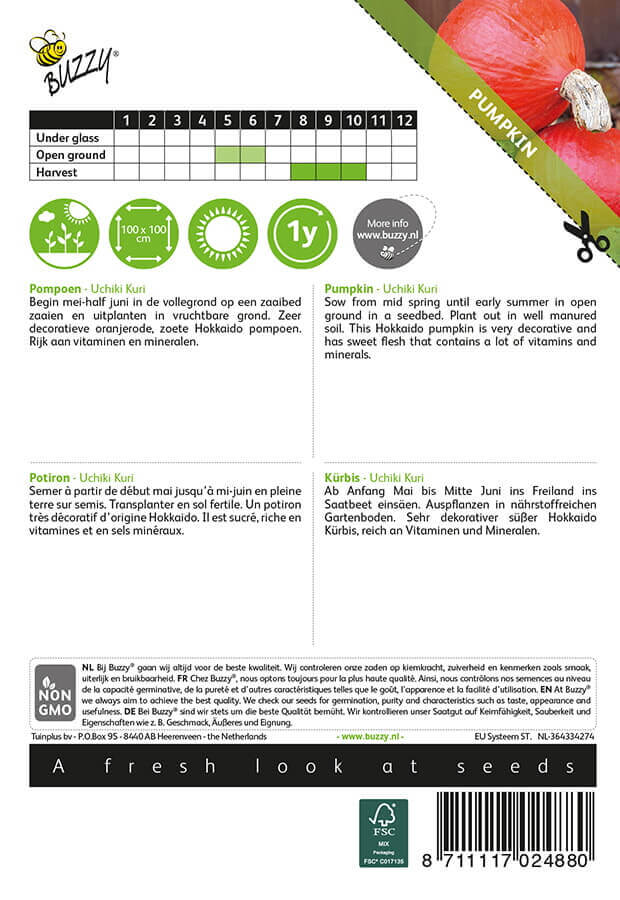 Hokkaido græskaret – ‘Uchiki Kuri’ eller ‘Orange Sun’ som den også kaldes, kan veje op til 1,5 kg og har et mørkt, saftigt og velsmagende gult frugtkød. Efter høst, kan den holde sig optil 4 uger, når den opbevares mørkt og køligt. Kan forspires og udplantes på friland, i en næringsrig jord, på et solrigt og lunt voksested. Må ikke udtørre. Meget dekorativ sort. Græskarene kan sædvanligvis høstes fra august til oktober