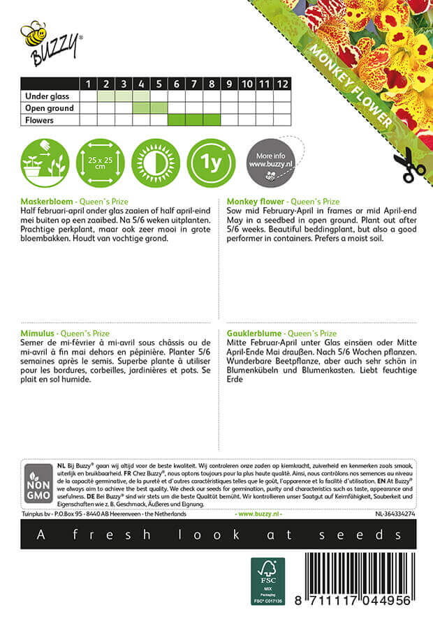 Maskerblomst ‘Queen’s Prize’ er en smuk og farverig sommerblomst med karakteristiske, plettede blomster i varme gul- og rødlige nuancer. Den er ideel som bedplante, men trives også rigtig godt i krukker og altankasser. Planten foretrækker en fugtig jord og blomstrer rigt gennem sommeren.