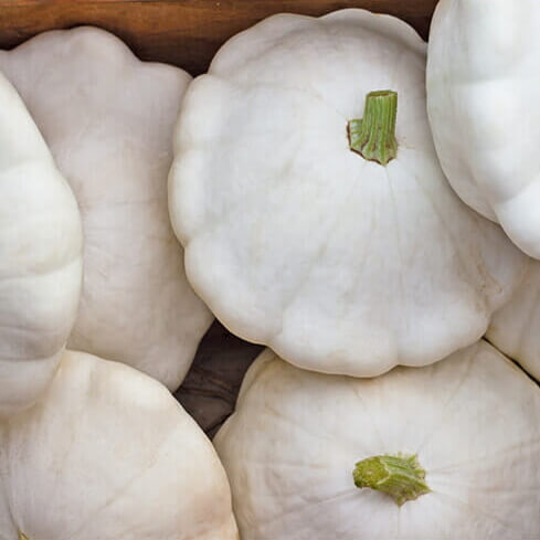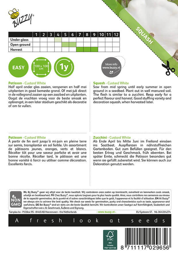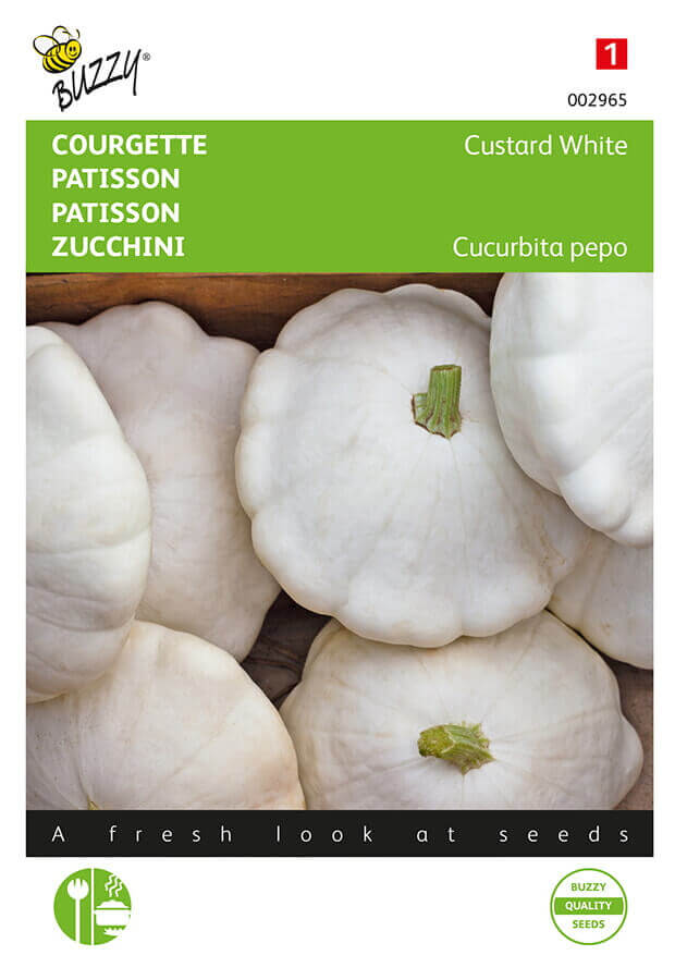 ‘Custard White’ er en meget interessant sommer squash, som producerer hvide specielt udseende squash med en meget fin smag. Ikke alene er den vældig dekorativ, men også spiselig – og kan både grilles eller bruges som fyldte squash. Smagen er bedst, når de høstes tidligt. Kan forspires fra midt april, prikles og plantes ud fra midten af maj i en næringsrig jord på et beskyttet og lunt voksested. De kan sædvanligvis høstes fra juli til september. Det anbefales at dyrke dem med god afstand imellem planterne.