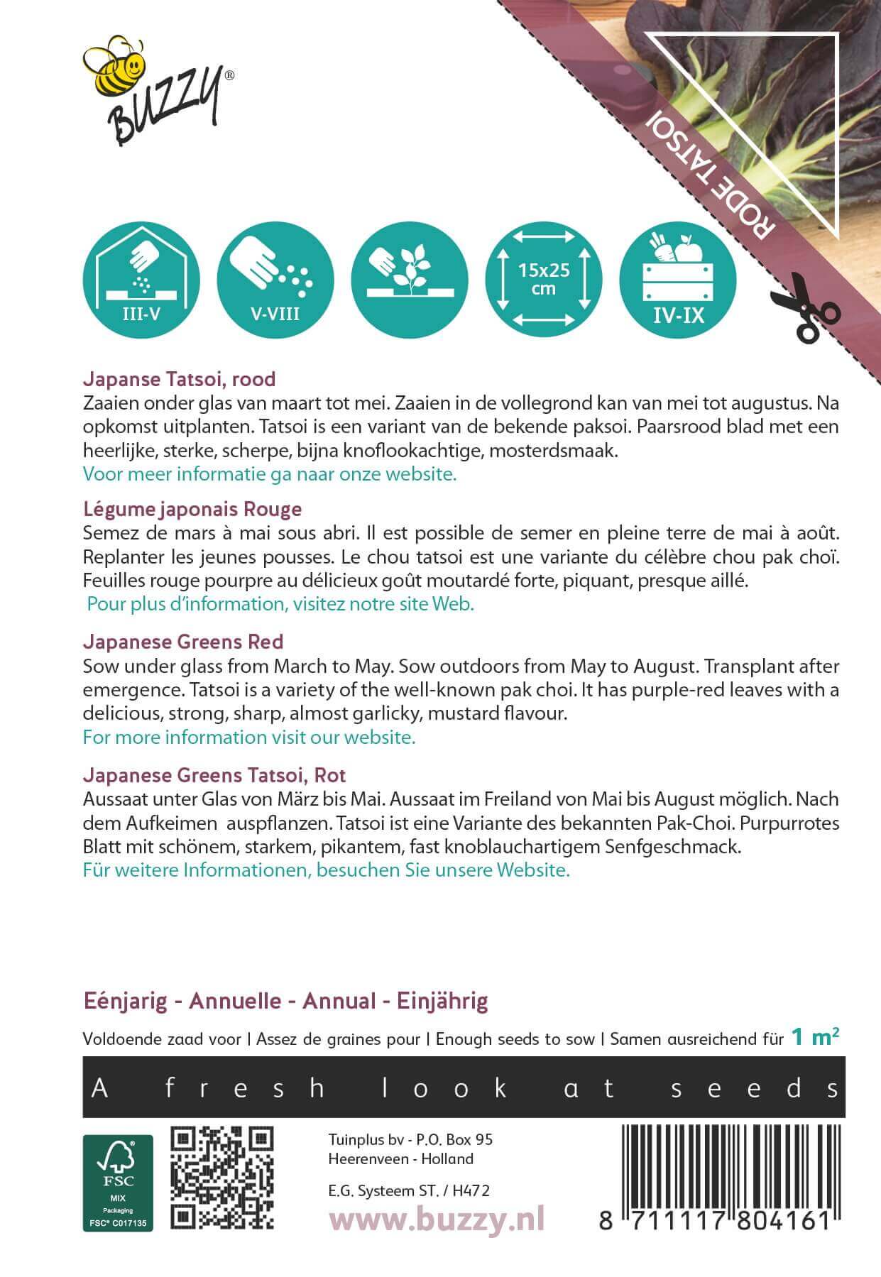 Anvendelse: Helt utroligt smuk bladgrøntsag, der danner yndige dekorative rosetter. Tatsoi er en variant af den velkendte pak choi. Den har lilla-røde blade med en lækker, stærk, skarp, næsten hvidløgsagtig, sennepssmag. Ser fantastisk ud i haven såvel som på tallerkenen. Kan steges, sauteres, grilles eller skæres tyndt og tilsættes supper, kolde nudelsalater og slaws. Let og hurtigvoksende.