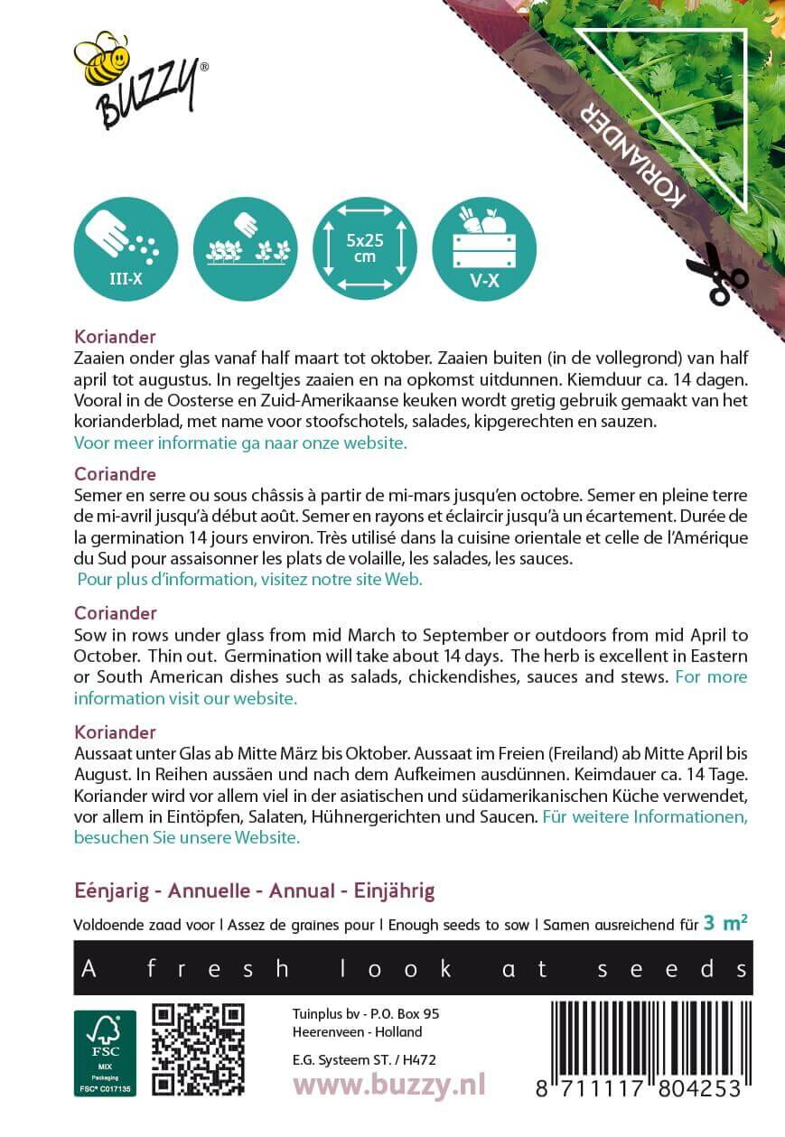 Planten er hurtigvoksende og velegnet både til dyrkning i haven og i potter. Ved løbende såning kan der høstes friske blade gennem en stor del af sæsonen. Koriander kan også gå i blomst og danne frø, som bruges som krydderi.