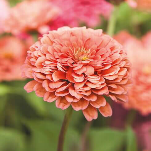 Zinnia Eldorado er en klassisk og meget dekorativ sommerblomst med store, fyldte blomster i en varm lakse-orange nuance. Blomsterne står på kraftige stængler og giver et frodigt og farverigt udtryk i haven gennem hele sommeren.