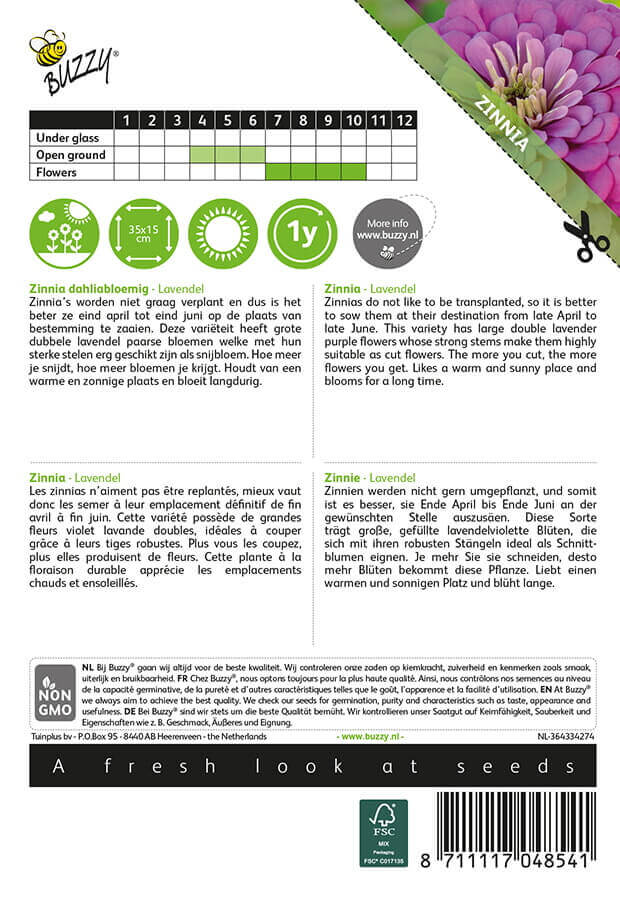 Planten trives bedst på et varmt og solrigt voksested og blomstrer rigt og vedvarende hele sommeren. Zinnia Lavendel er ideel i blomsterbede, skærehaver og buketter og tilfører haven et romantisk og farverigt udtryk.